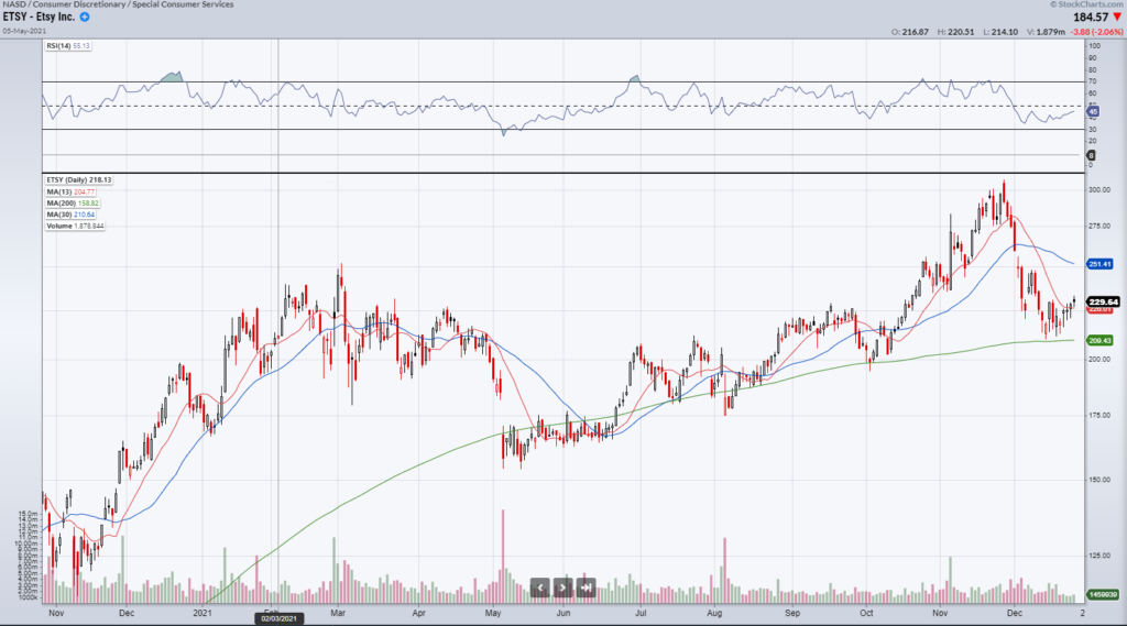 ETSY– I like that base above the 200 Day moving average. 210 continues to get tested and show support. ETSY continues to bounce off that level.Â