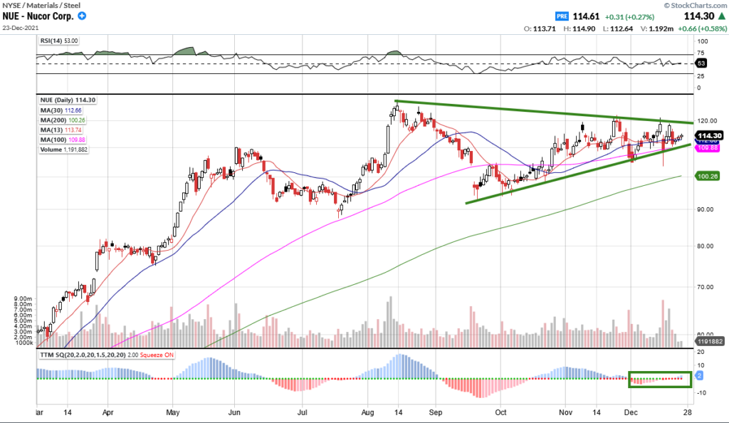 Nucor Corp (NUE) daily chart is forming a daily rising wedge pattern where the bulls are pushing higher against the 13, 30, and 100 daily moving averages. Â