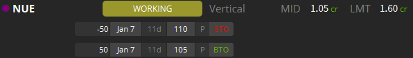 Once again, I am looking to sell a put spread. I have a working order to sell the 110 puts and buy the 105 puts.Â