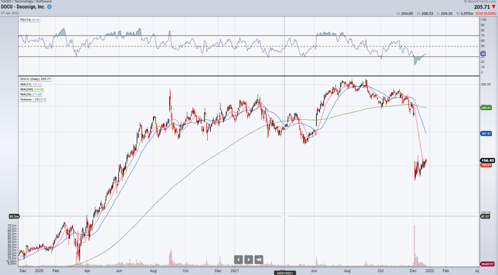 I haven’t put in any orders in DOCU yet but would look at possibly taking a position at the lower end of the range at $135. Alternatively, if it were to break out above $155 to $160+ I would consider getting in on a pullback that tests the $155 level, which was prior resistance.