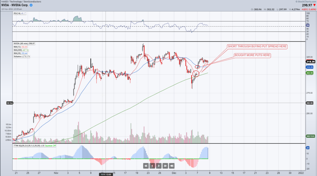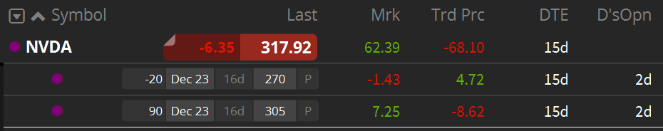 Yesterday on Wednesday, I added to the position in the morning as NVDA opened higher by buying 70 more puts at the 305 strike price. I plan to sell puts against that if NVDA has another sharp drop. That is “legging” into the spread. Although this trade is moving against me, NVDA is at a resistance area which I expect to hold. The puts expire on December 23, so I have a couple of more weeks for the trade to work.